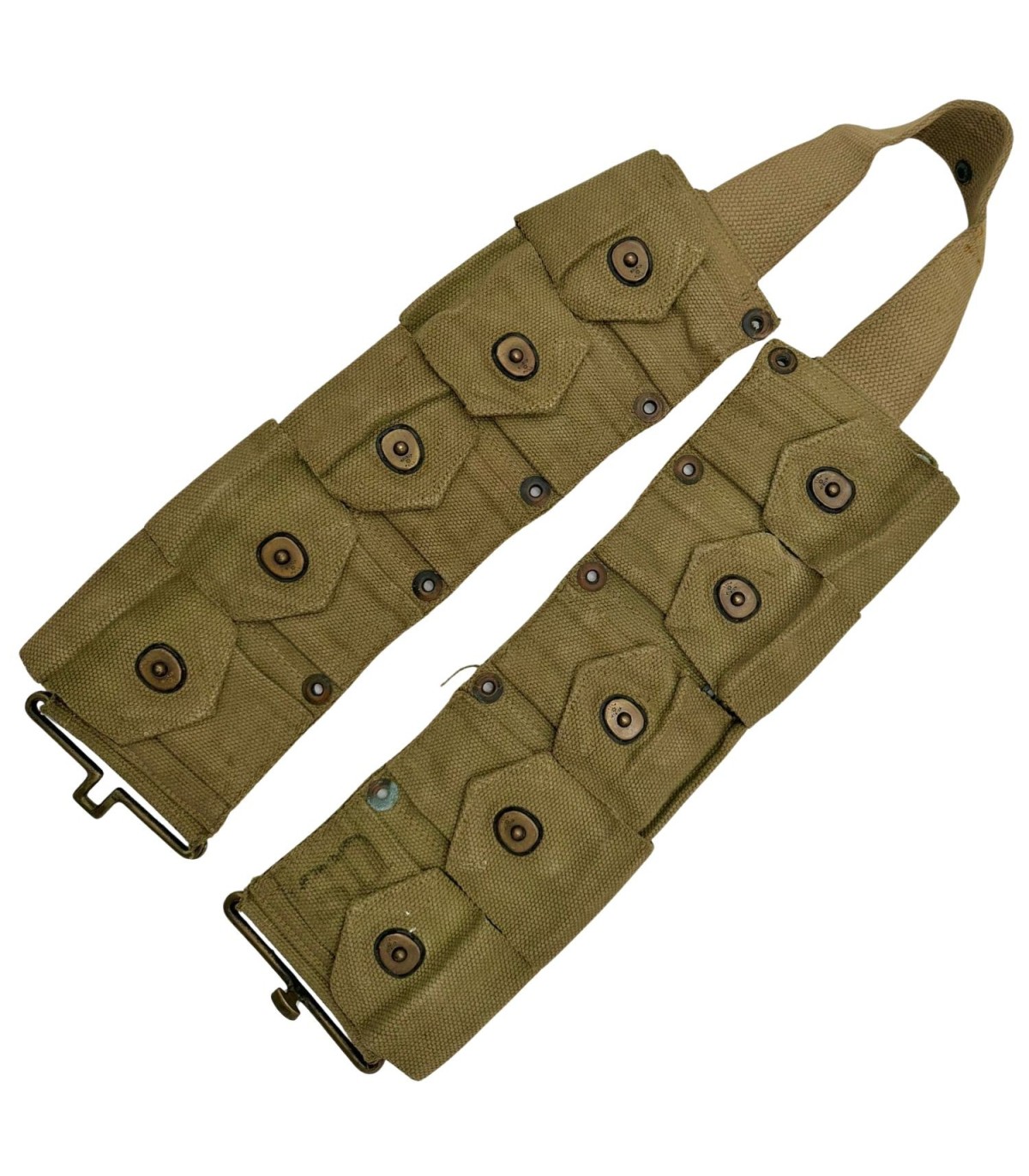 Ceinturon porte-chargeurs M1 Garand 100 % authentique WWII, daté 1943. Modèle réglementaire utilisé par les fantassins US Army, doté de 10 poches pour clips de 8 cartouches.