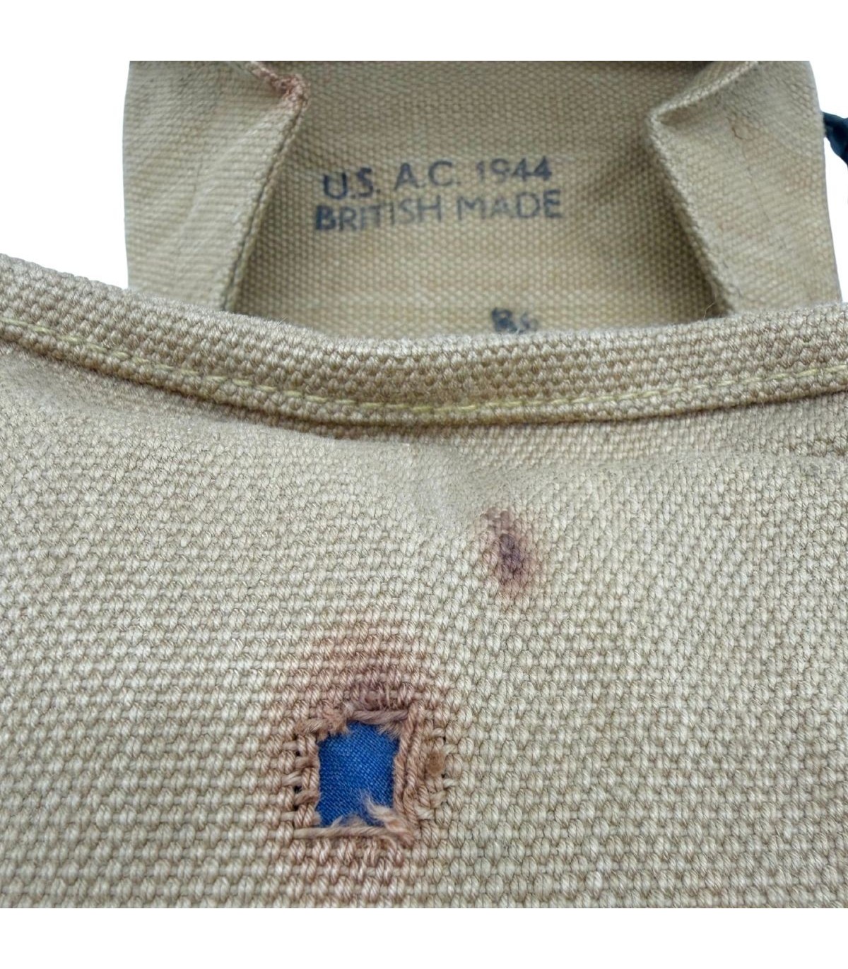 Trouver une pièce de 1944 dans cet état est une chance inouïe pour un collectionneur. Cet exemplaire est ce que l'on appelle un "New Old Stock" (NOS) : il n'a jamais été distribué en unité et n'a jamais vu le terrain. La toile a conservé sa couleur d'origine, vive et profonde, et les marquages "U.S. A.C. 1944" sont d'une netteté remarquable. Bien que l'objet soit neuf, le temps a laissé de légères traces de son long stockage : on note quelques petites pointes de rouille sur les parties métalliques et deux petits trous de stockage. Ces détails, loin de gâcher la pièce, sont la preuve irréfutable de son authenticité et de son âge.