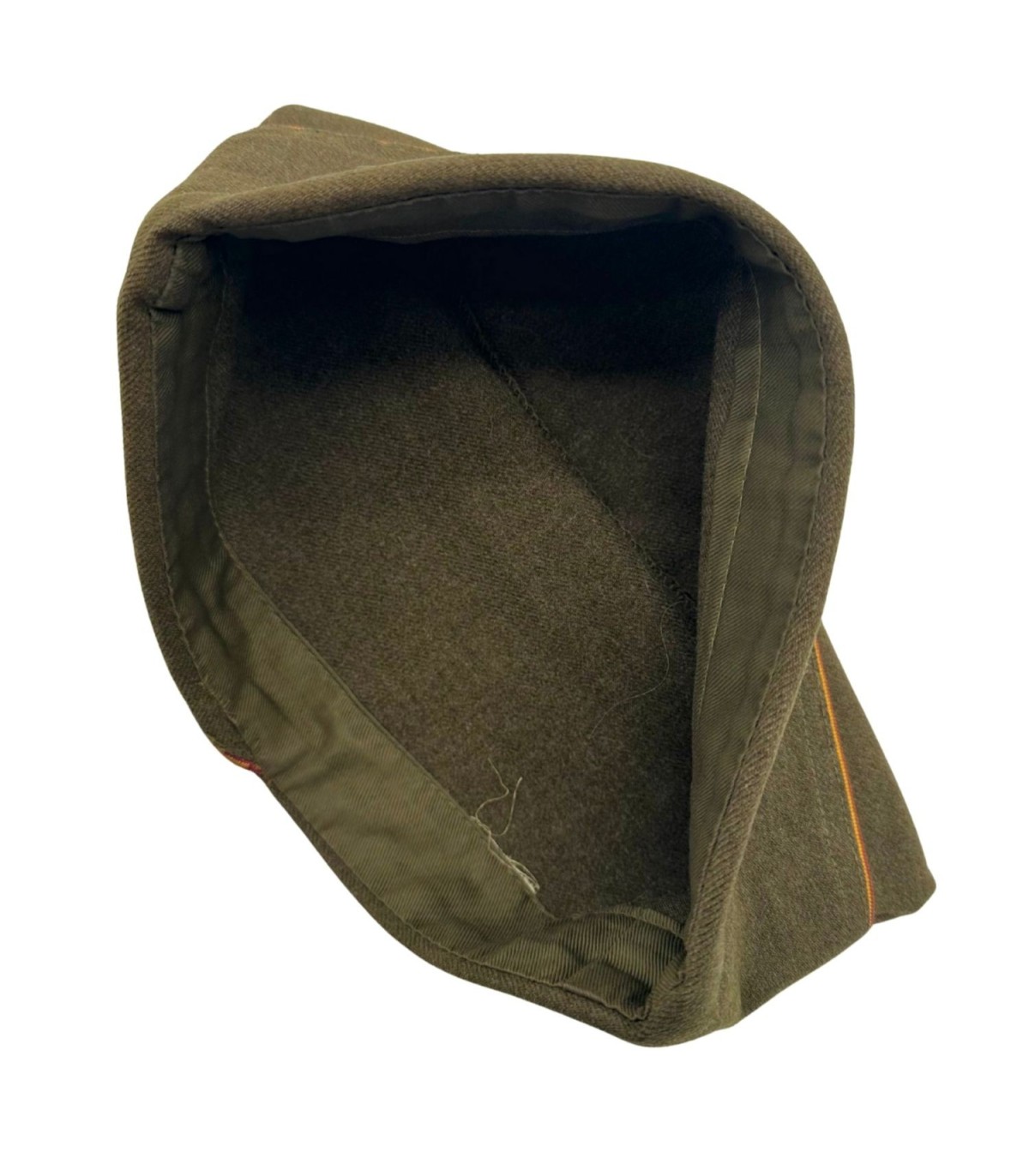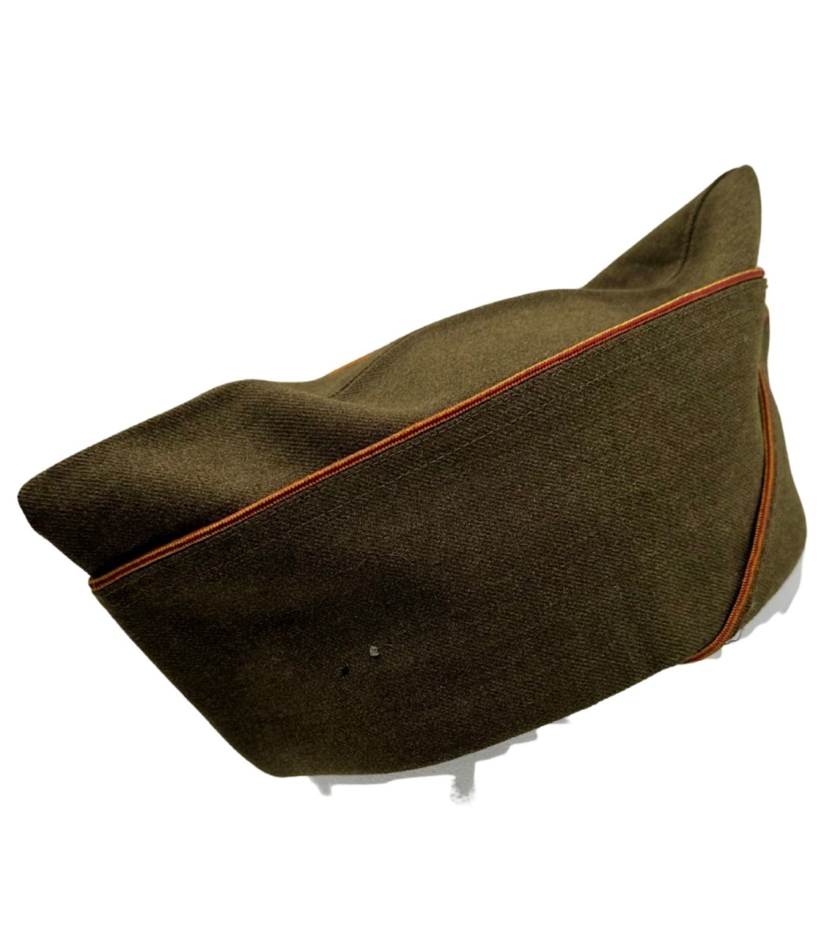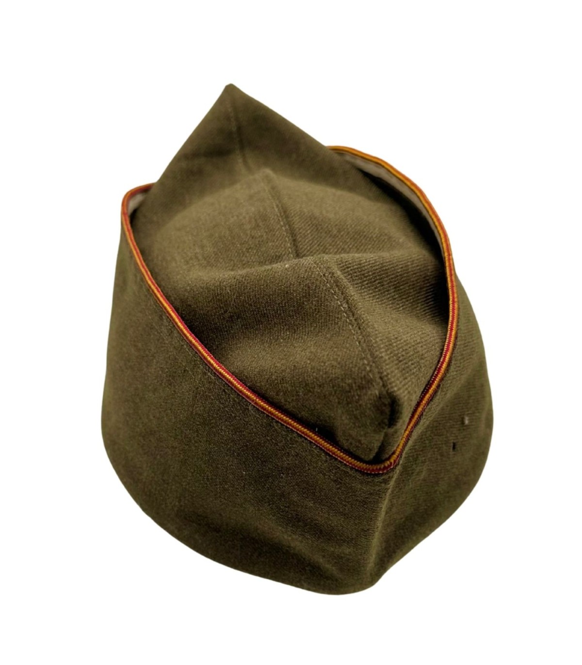 Cet exemplaire est une pièce de confection militaire authentique, réalisée dans une laine de haute qualité (souvent de la serge de laine de couleur Olive Drab). Sa forme profilée et sa souplesse sont les marques d'une fabrication d'époque destinée à être facilement glissée sous le ceinturon ou dans une poche de veste lorsque le soldat portait son casque M1. À l'intérieur, on retrouve généralement le bandeau de sudation en cuir ou en toile, typique des standards de l'armée américaine des années 40. La patine de la laine et la tenue du liséré confirment qu'il s'agit d'un objet ayant traversé les décennies tout en conservant son prestige.