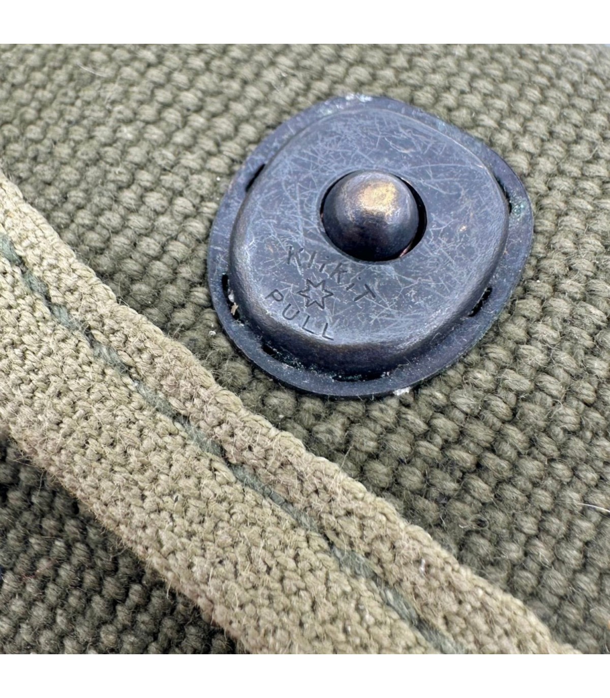La housse en toile (Carrier) de cet ensemble est particulièrement intéressante. Fabriquée par la firme Tractor Cab Co. (dont le marquage est parfois difficile à lire selon l'usure du tampon encreur), elle est datée de 1944. Ce fabricant, spécialisé à l'origine dans les cabines de tracteurs, a mis son savoir-faire au service de l'effort de guerre en produisant des articles en toile lourde d'une grande robustesse. Le marquage est encore présent, tout comme le célèbre tampon "U.S." sur le devant. La sangle abîmée par le stockage mentionnée sur d'autres pièces n'est pas un problème ici : cette housse est saine et complète avec son crochet de fixation.