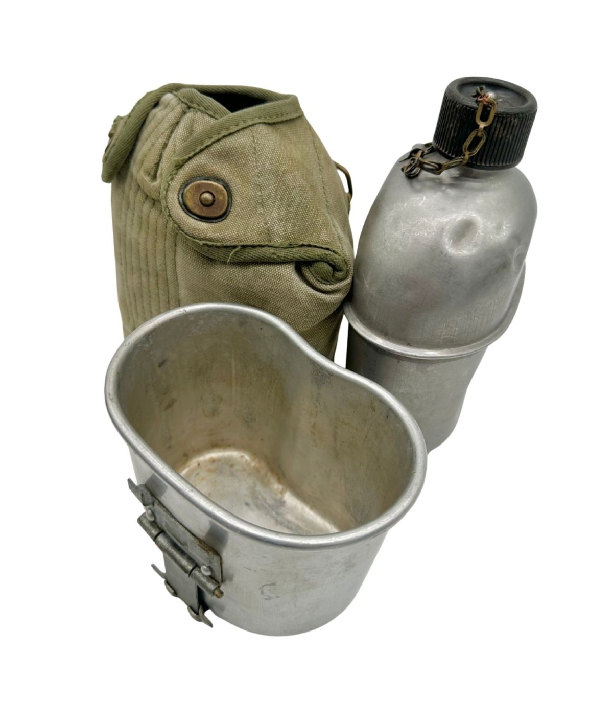 L'ensemble est dans un état de conservation superbe, avec une patine authentique qui n'altère en rien la solidité des pièces. Les marquages de l'intendance et les dates sont vifs et nets, un critère essentiel pour la valeur d'une pièce de collection. Le bidon s'insère parfaitement dans le quart, formant le duo indissociable que chaque soldat portait au ceinturon. Que vous soyez un reconstituteur méticuleux ou un collectionneur passionné, cet ensemble "Full 1945" représente un investissement sûr et une pièce d'histoire palpable.
