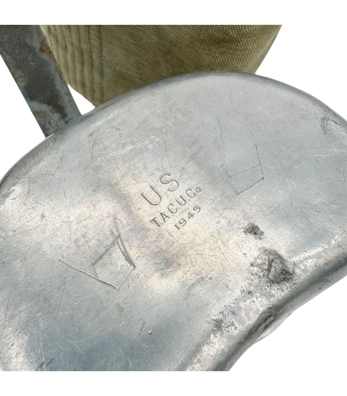 Le Quart : Fabriqué par TACU Co (The Aluminum Cooking Utensil Co.) en 1945. Ce fabricant est réputé pour la robustesse de ses équipements de cuisine de campagne. Le quart est en acier inoxydable, avec sa poignée repliable caractéristique et un marquage parfaitement lisible.