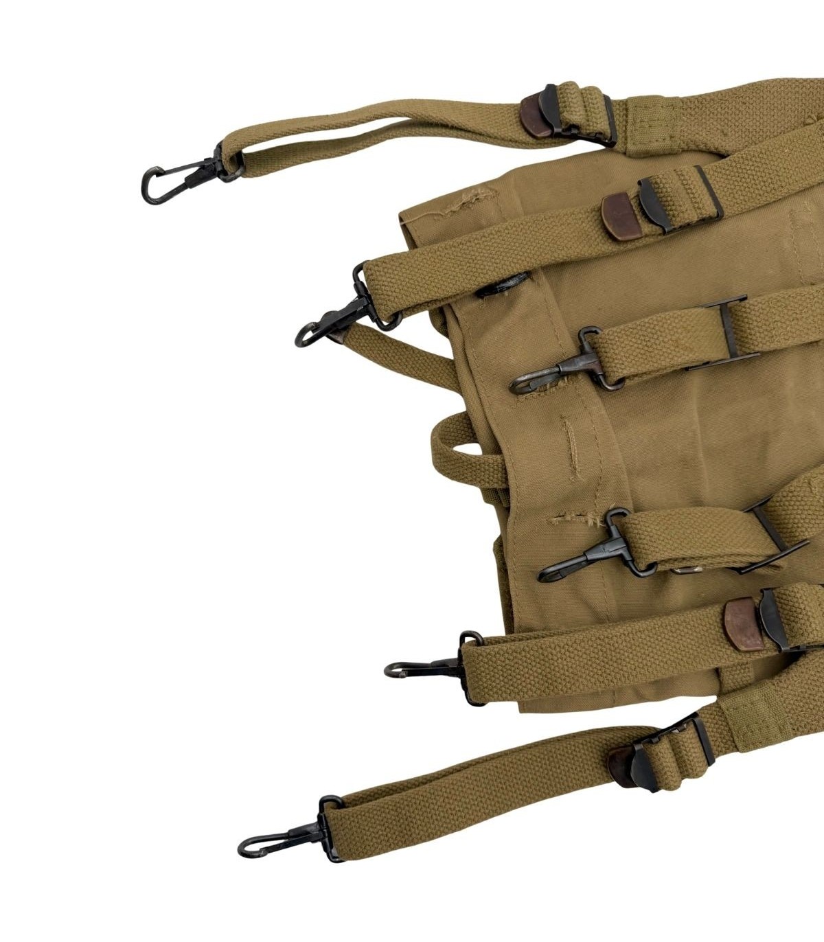Accastillage Complet : Toutes les boucles en laiton ou acier peint et les crochets de fixation au ceinturon sont présents. Rien ne manque pour l'assembler à un ceinturon cartouchière M-1923.