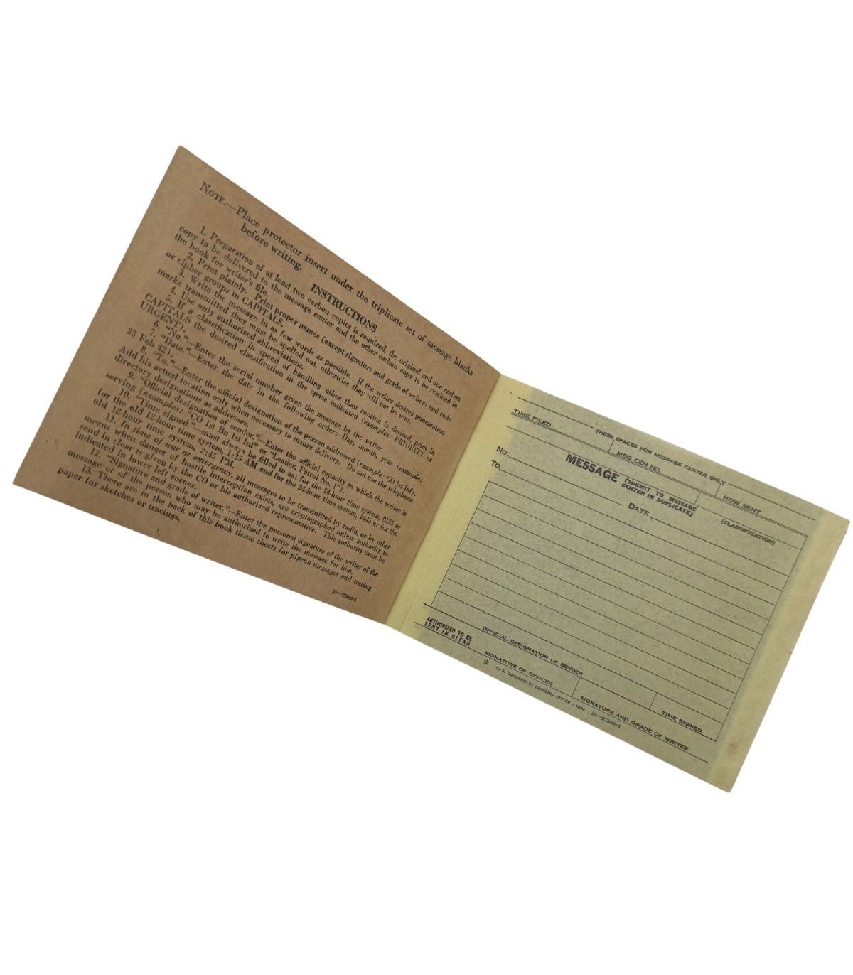 Si le carnet M-210-A est un classique de l'équipement de transmission, il est devenu extrêmement difficile de le trouver dans cet état de complétude. Cet exemplaire contient la totalité de ses 25 feuilles de message, chacune accompagnée de son feuillet duplicata (papier carbone), permettant de garder une trace écrite de l'ordre transmis.