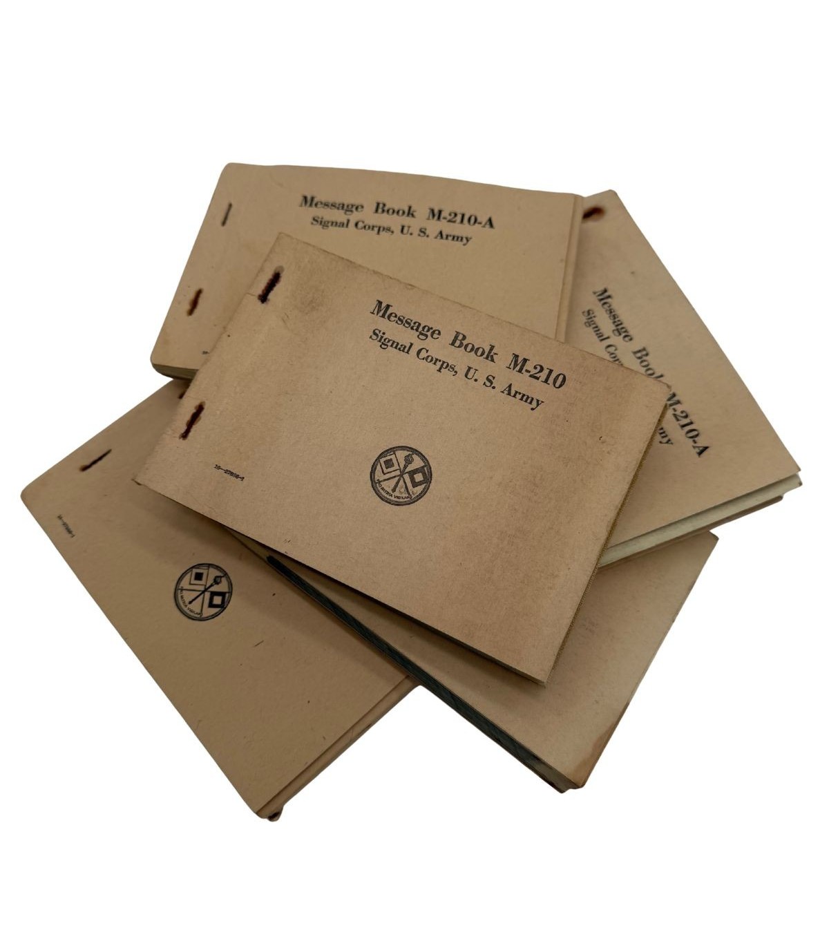 Le Message Book M-210-A est un élément réglementaire essentiel de l’équipement du Signal Corps de l’U.S. Army durant la Seconde Guerre mondiale. Utilisé pour la transmission rapide d’ordres tactiques, de comptes rendus et de messages chiffrés, il accompagnait quotidiennement opérateurs radio, observateurs d’artillerie et officiers sur tous les théâtres d’opérations.