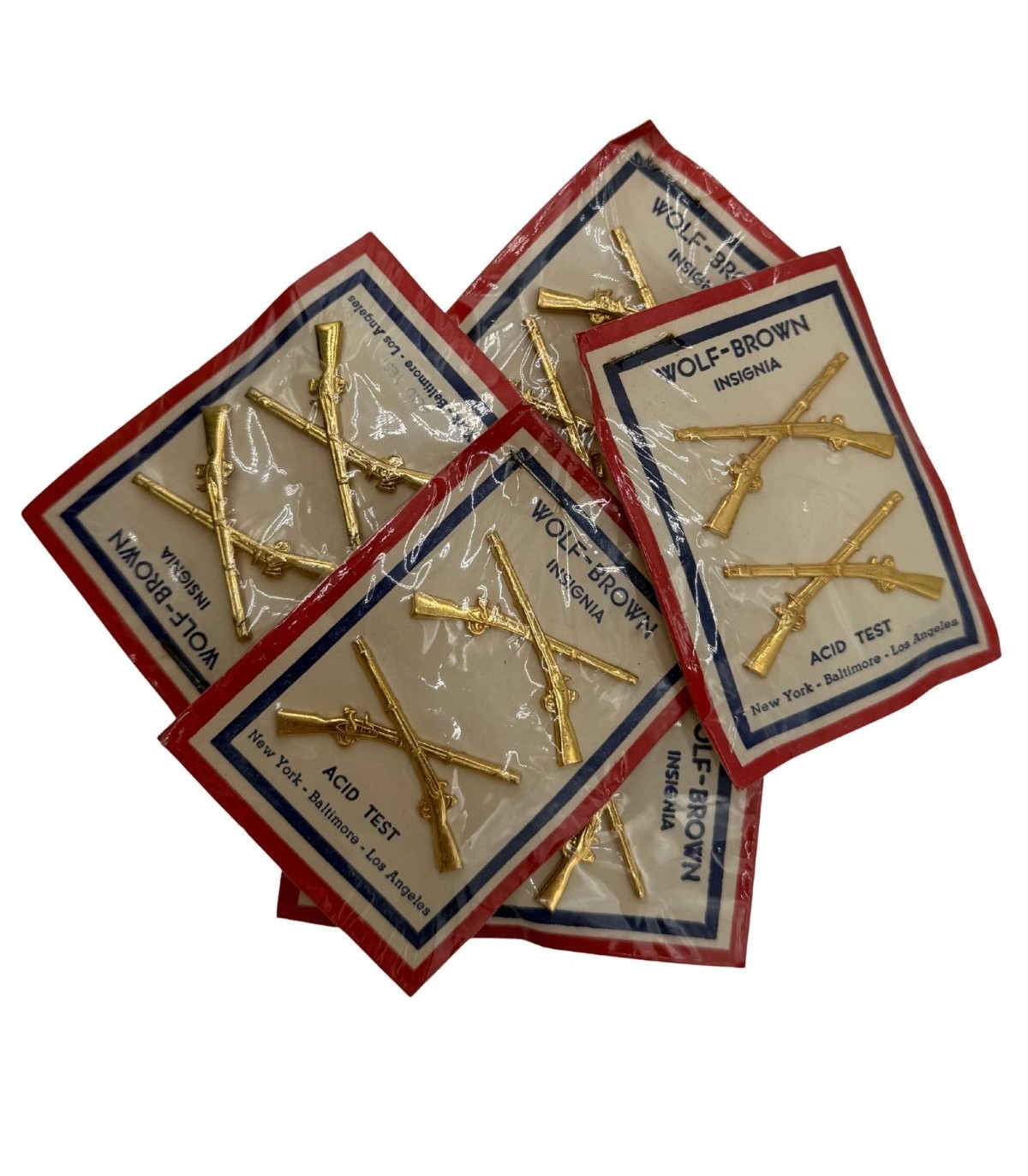Le support cartonné arbore fièrement la griffe de la célèbre WOLF-BROWN Insignia, avec ses trois comptoirs historiques : NEW-YORK - BALTIMORE - LOS ANGELES. Ce fabricant était le choix de prédilection des officiers soucieux de la finesse de leurs attributs.