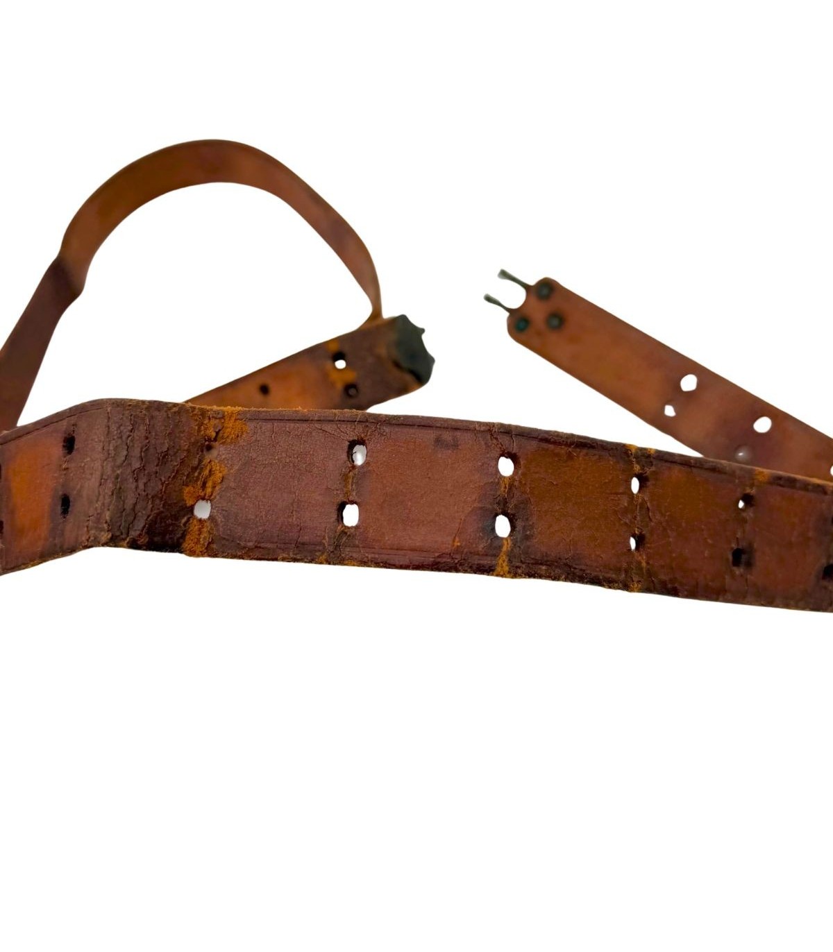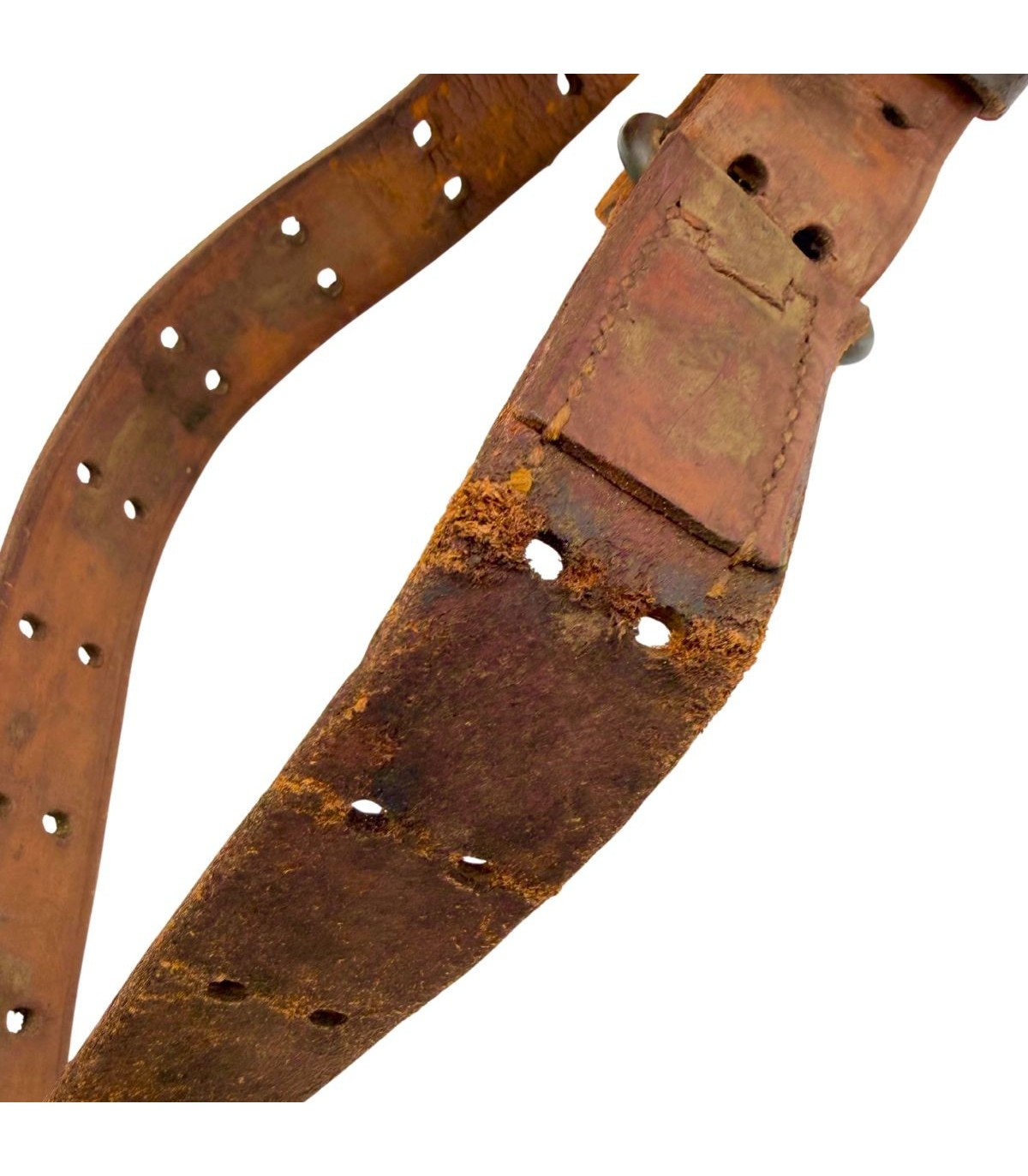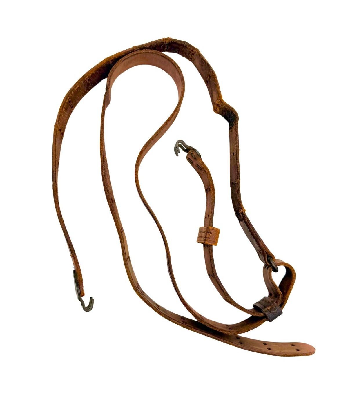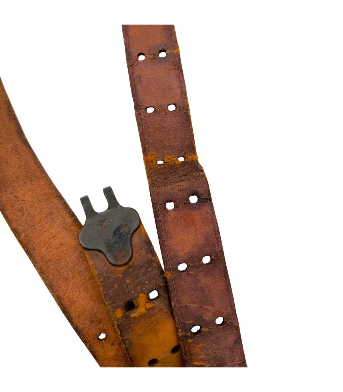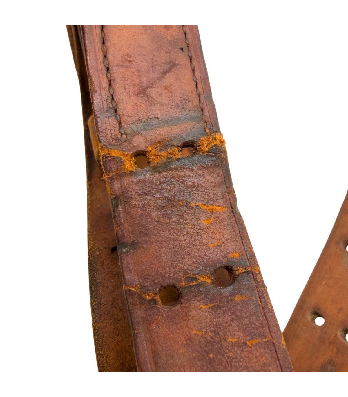 Le cuir épais est souple et intact, avec brins et crochets d’origine en métal. Pièce authentique "dans son jus", elle peut être restaurée pour retrouver sa flexibilité et sa patine de combat historique.