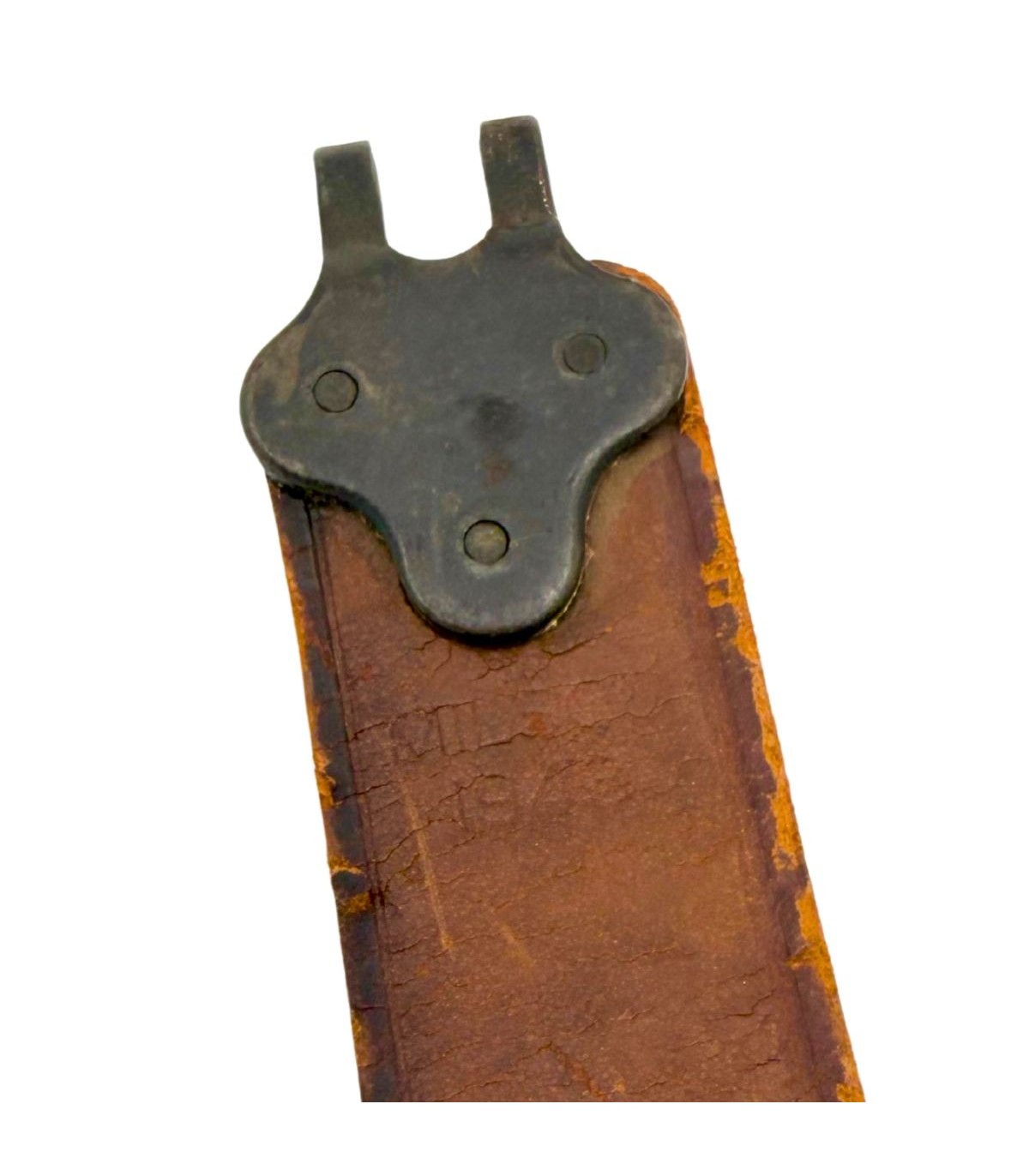 Équipement emblématique du fusil M1 Garand et du Springfield M1903, cette bretelle M-1907 en cuir servait à la fois pour le transport et la stabilité de tir. Fabriquée par Milsco en 1943, elle est un exemple rare de qualité militaire américaine de la Seconde Guerre mondiale.
