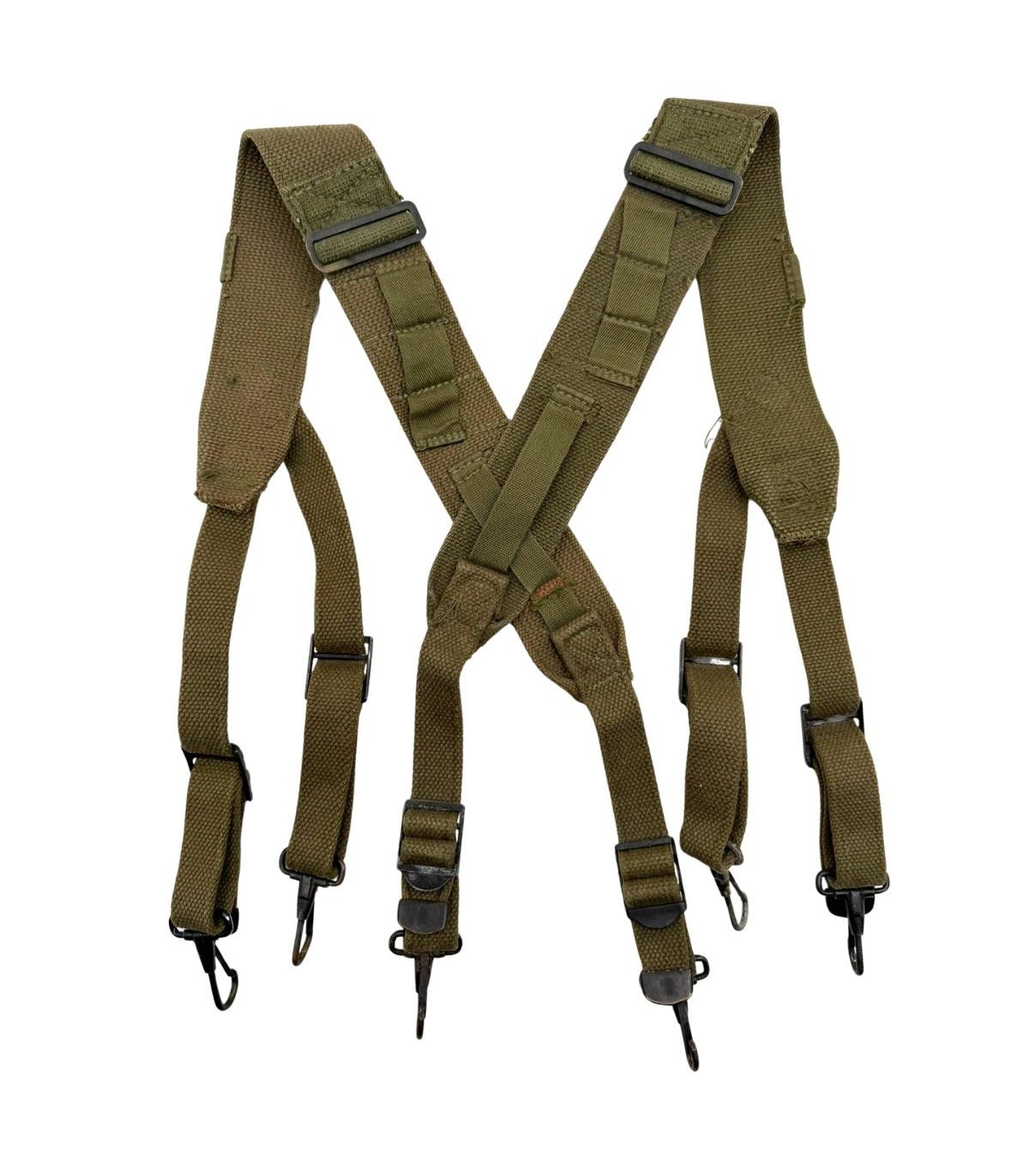 Complet : L'exemplaire est complet avec ses deux sangles principales, ses sangles de rappel pour le sac à dos (Field Pack) et l'intégralité de ses crochets de fixation au ceinturon.