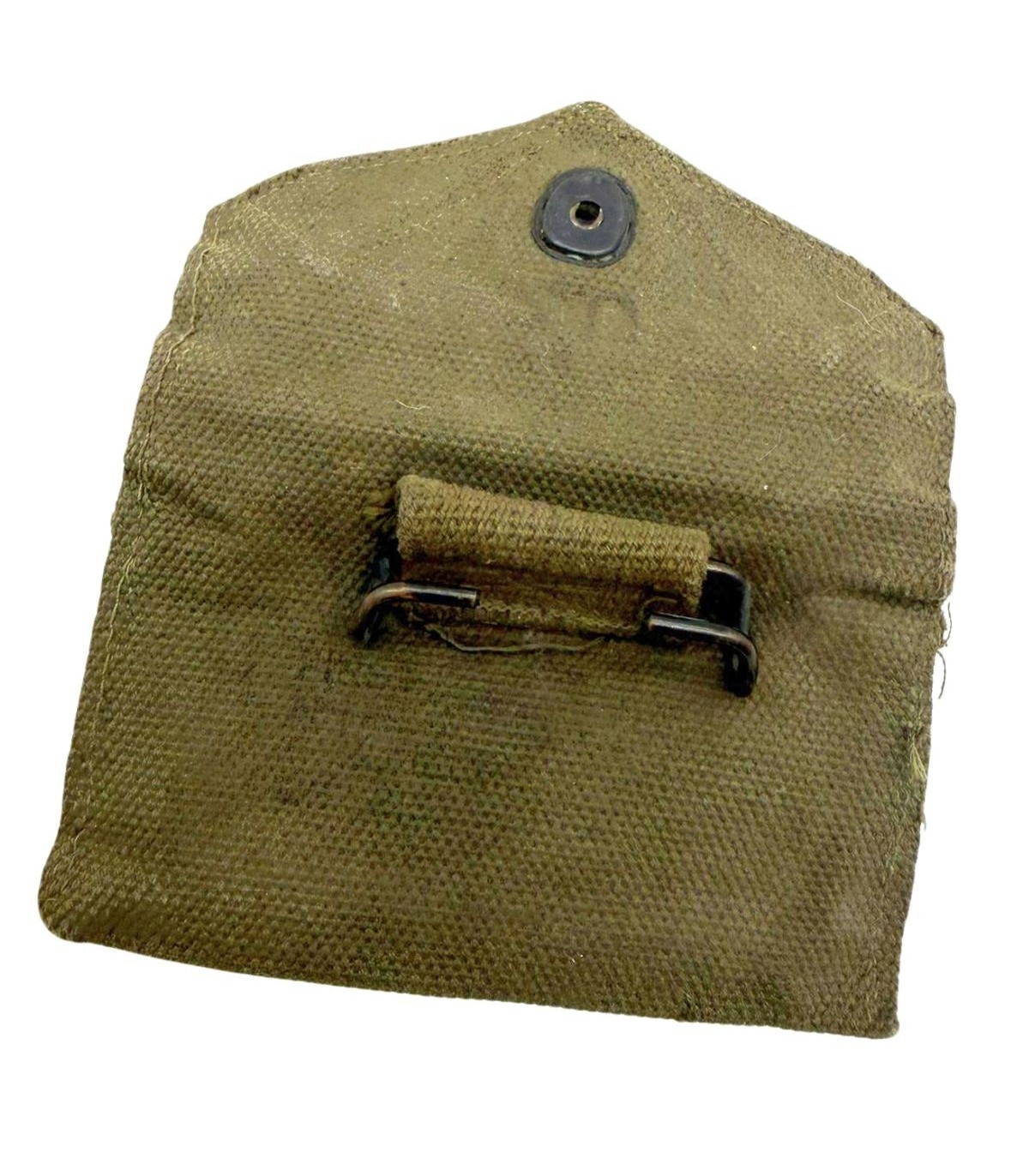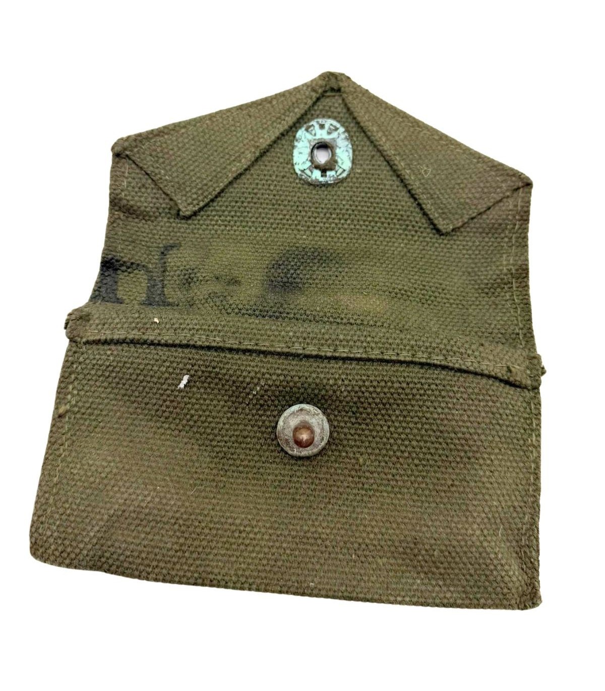 La pochette M-1942 est le modèle standard destiné à contenir le boîtier de pansement Carlisle. Elle succède au modèle M-1924. Cette version en toile OD7 (un vert olive foncé et profond) est caractéristique des productions lancées à partir de 1943 pour remplacer la teinte sable (OD3), offrant un meilleur camouflage dans les environnements européens et forestiers.