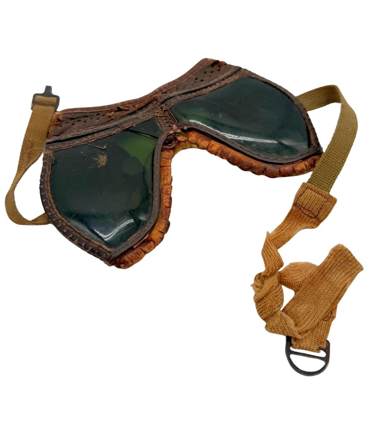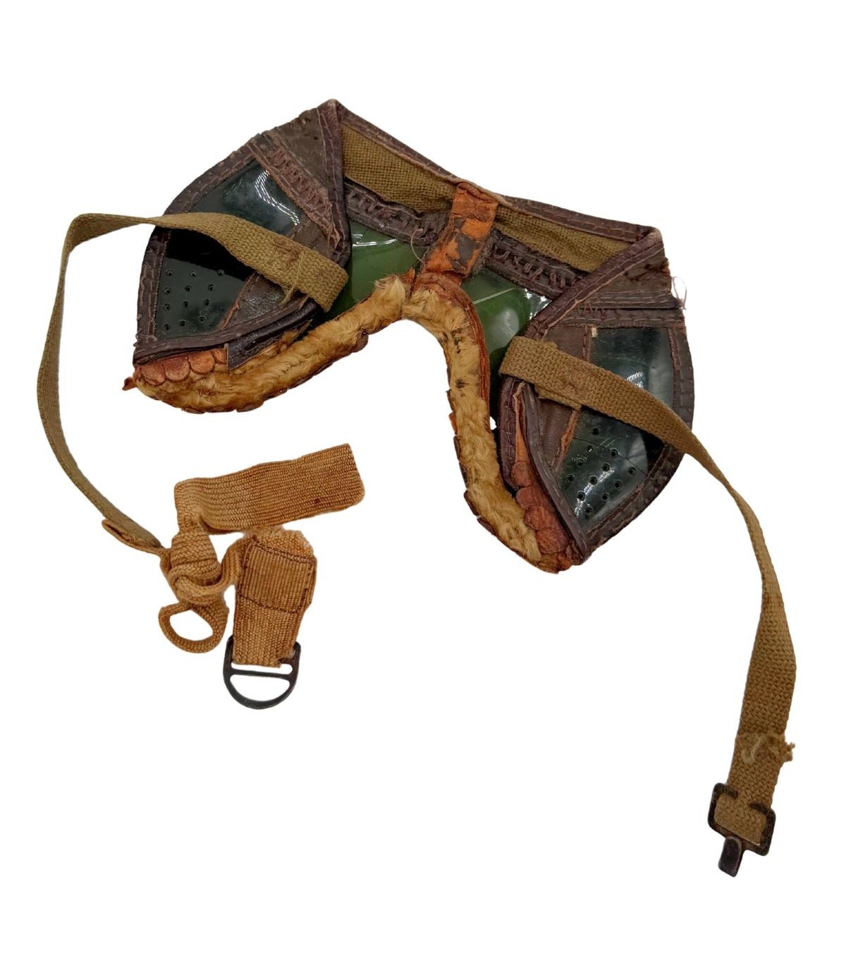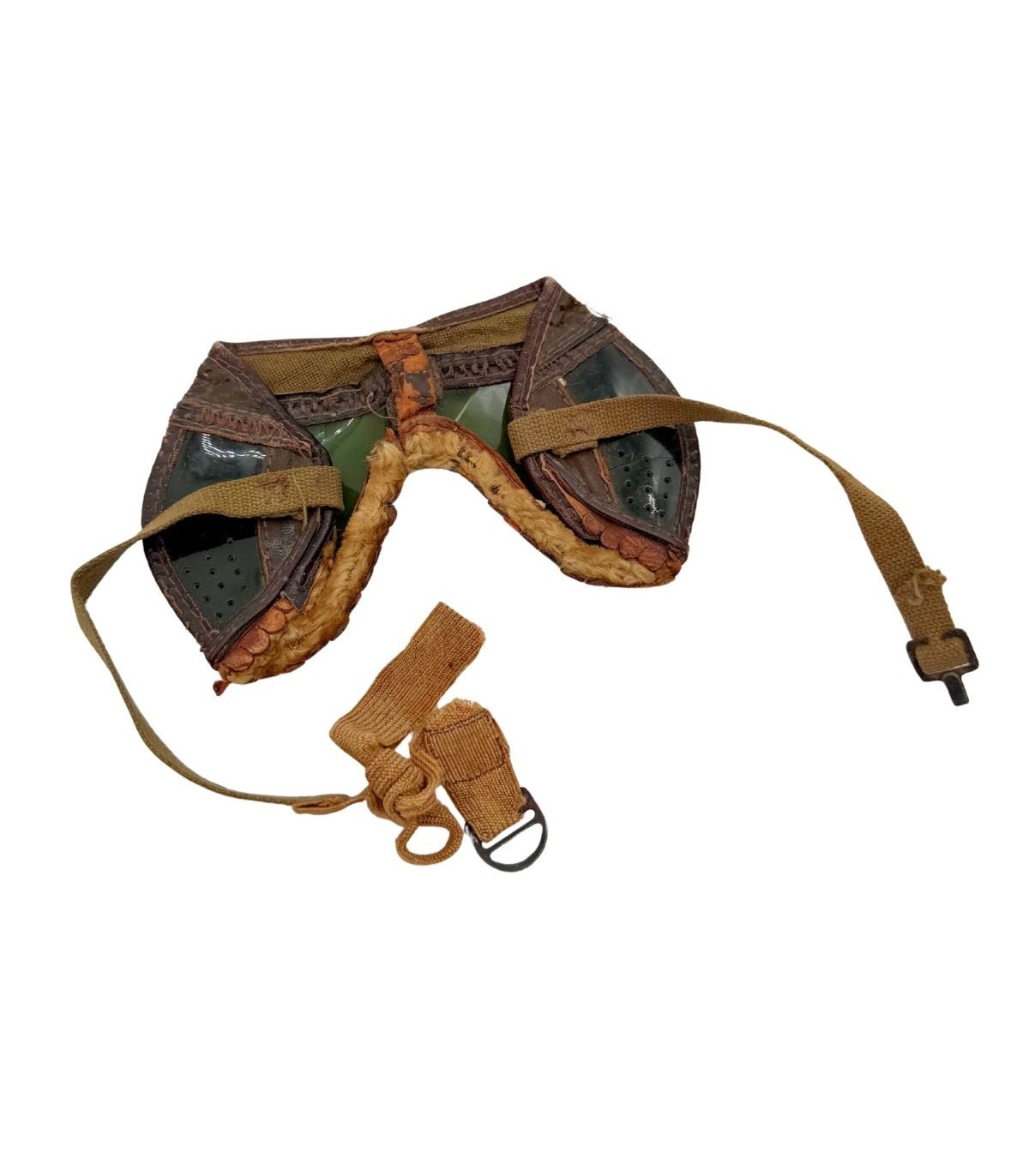 Modèle réglementaire Goggles M-1943, conçu pour protéger du vent, poussière et forte luminosité. Version équipée de verres acétate teintés vert, variante moins courante que les modèles clairs.