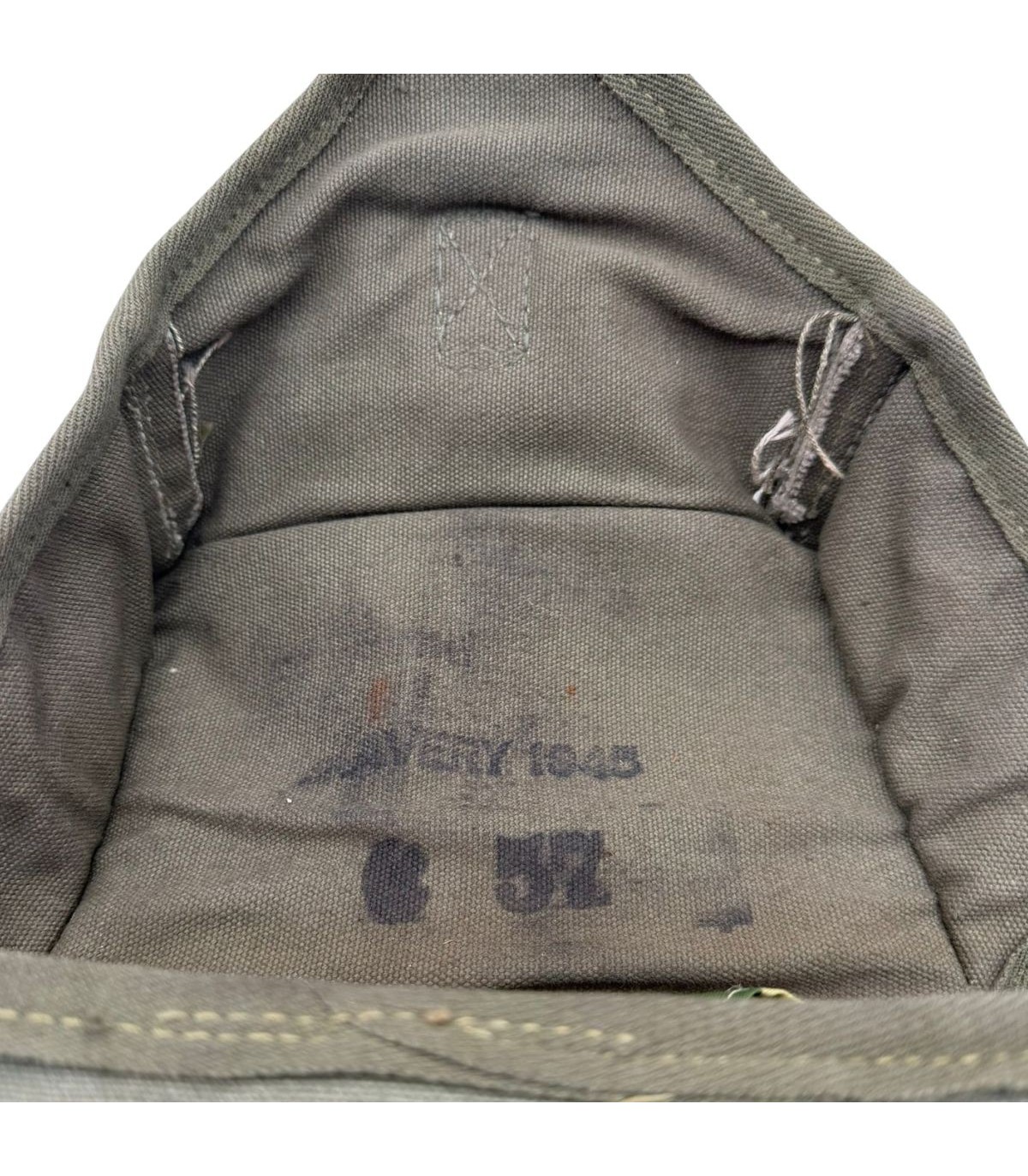 Bandoulière réglable d’origine, rabat à sangle et boucle métallique. Exemplaire en état Mint, toile vive sans usure, coutures parfaites. Marquages “AVERY 1945” nets et lisibles.