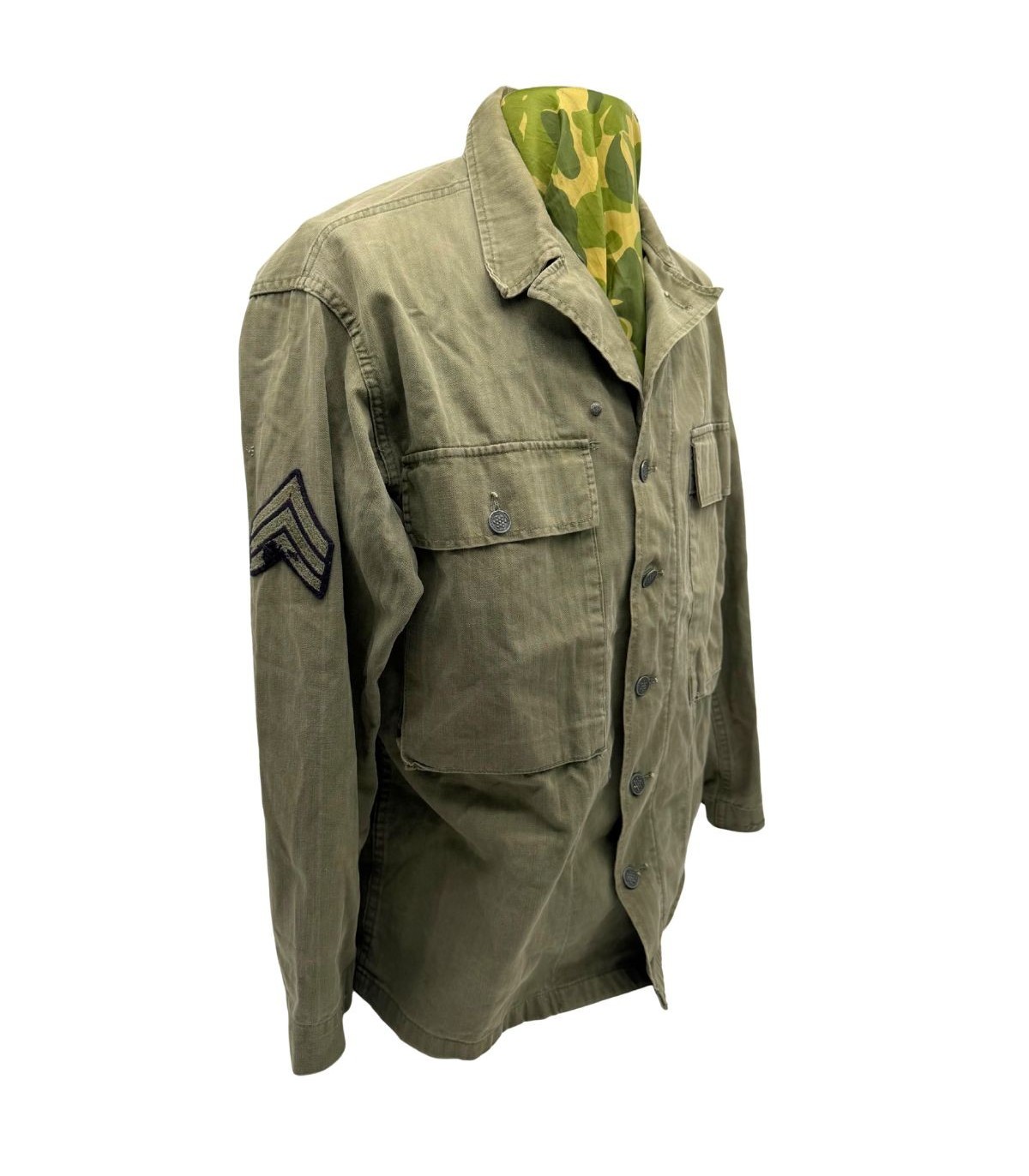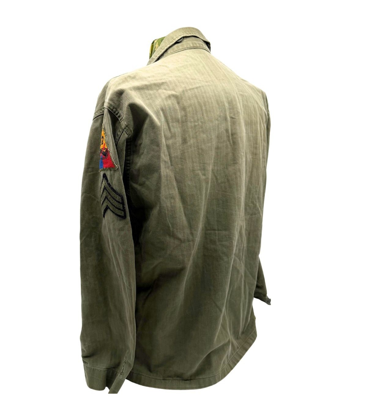 Cette veste HBT (Herringbone Twill) en sergé de coton à chevrons est le vêtement de combat et de travail polyvalent du GI. Robuste et respirante, elle a été largement utilisée sur le théâtre d'opérations européen, particulièrement par les troupes mécanisées. Cet exemplaire est monté d'origine pour un sous-officier de la prestigieuse 2nd Armored Division, surnommée "Hell on Wheels", une unité qui s'est illustrée de la Normandie jusqu'à Berlin.
