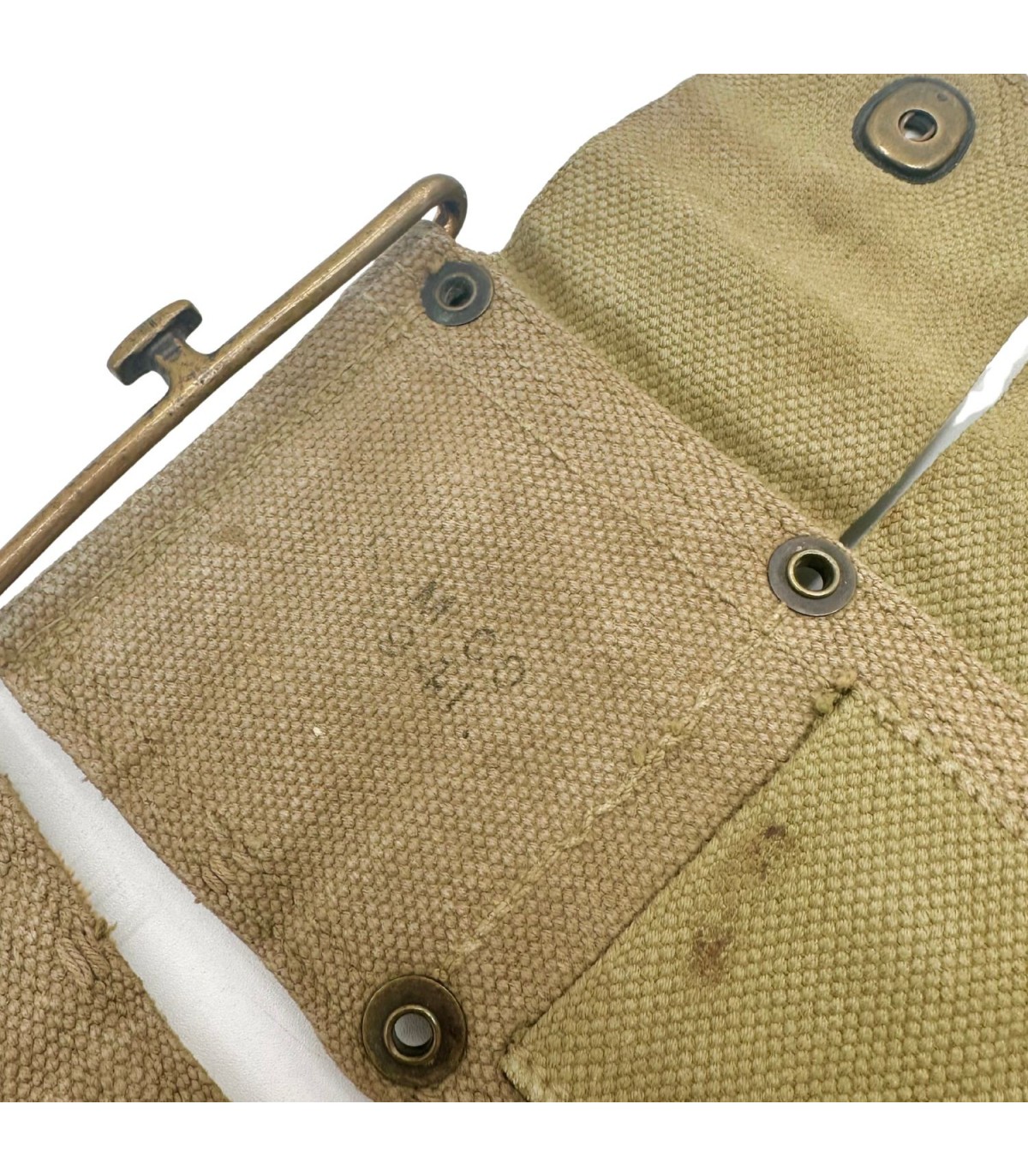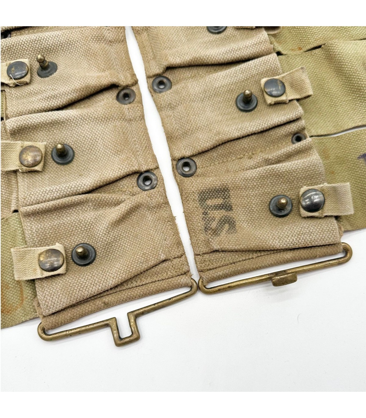 Cartouchière/ceinturon pour M1 garand d'origine deuxième guerre premier type bouclerie laiton. Cet exemplaire est complet et en très bon état. Encore solide, daté de 1941 et fabriqué par R.M Co.