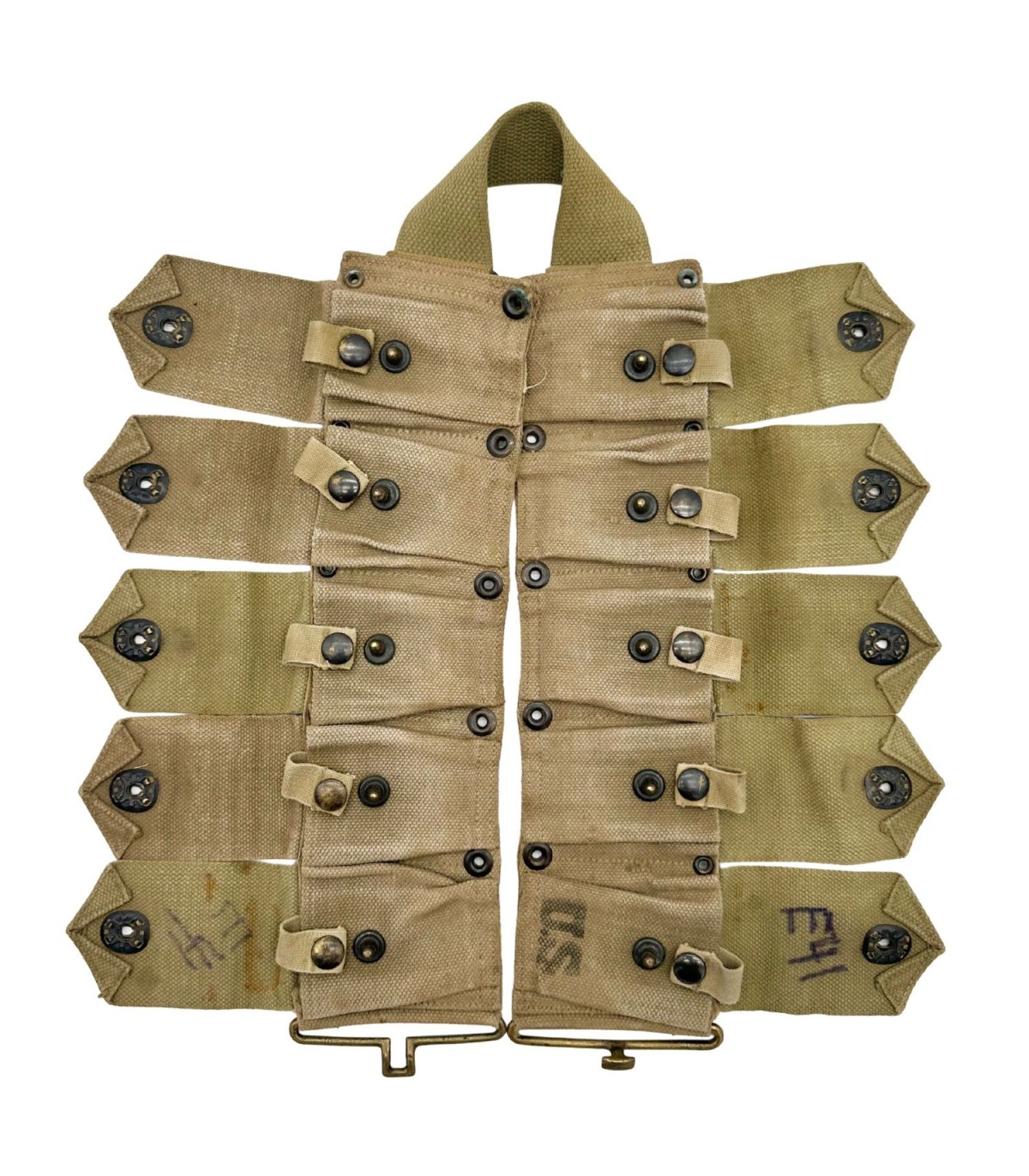 Fonction : Les 10 pochettes du ceinturon sont destinées à contenir 10 clips de huit cartouches calibre 30 pour le fusil Garand M1.