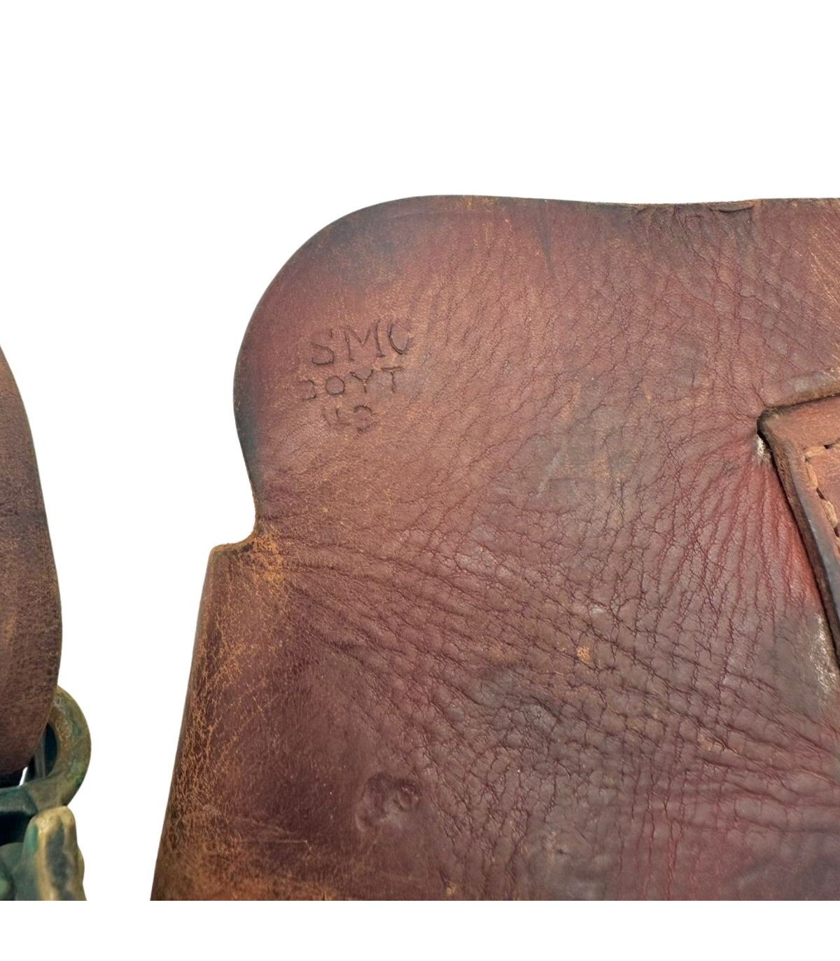 Modification d'Époque : La sangle a été modifiée par l'ajout d'un crochet en laiton. Ce type de modification (ajout de crochets pour attacher plus fermement le holster au ceinturon de combat ou au brelage) est une marque d'utilisation sur le terrain et ajoute un grand caractère historique à la pièce.