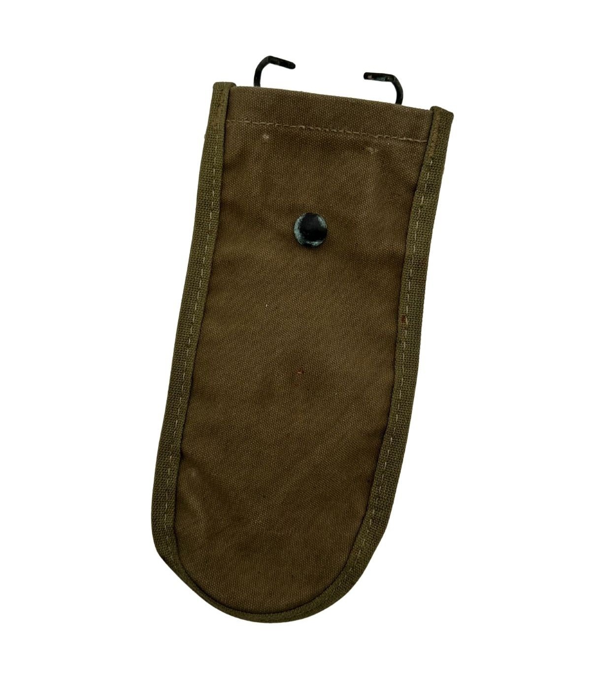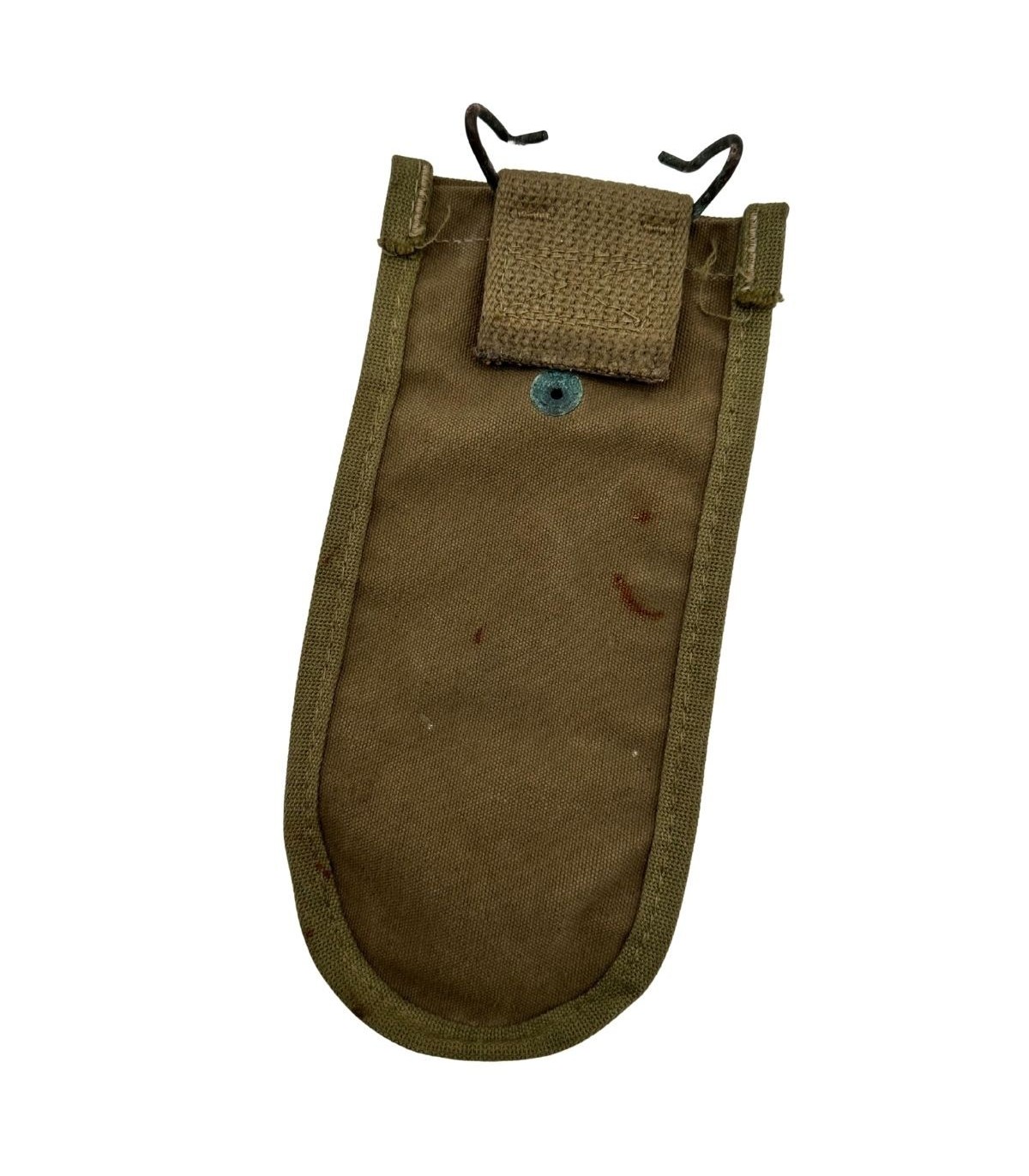 Ce qui rend cet exemplaire particulièrement intéressant pour un collectionneur averti, c’est sa fabrication. Elle est dotée d'une pression de type "Durable" marquée United Carr. La firme United Carr était le fournisseur de référence pour l'armée américaine, et le modèle de pression "Durable" est réputé pour sa robustesse exceptionnelle, conçue pour résister aux conditions climatiques extrêmes de la jungle. La toile, de couleur caractéristique, présente une patine authentique qui témoigne de son âge et de son histoire. L'aspect granuleux et la solidité de la couture sont les preuves d'une fabrication d'époque destinée à l'usage intensif au combat.