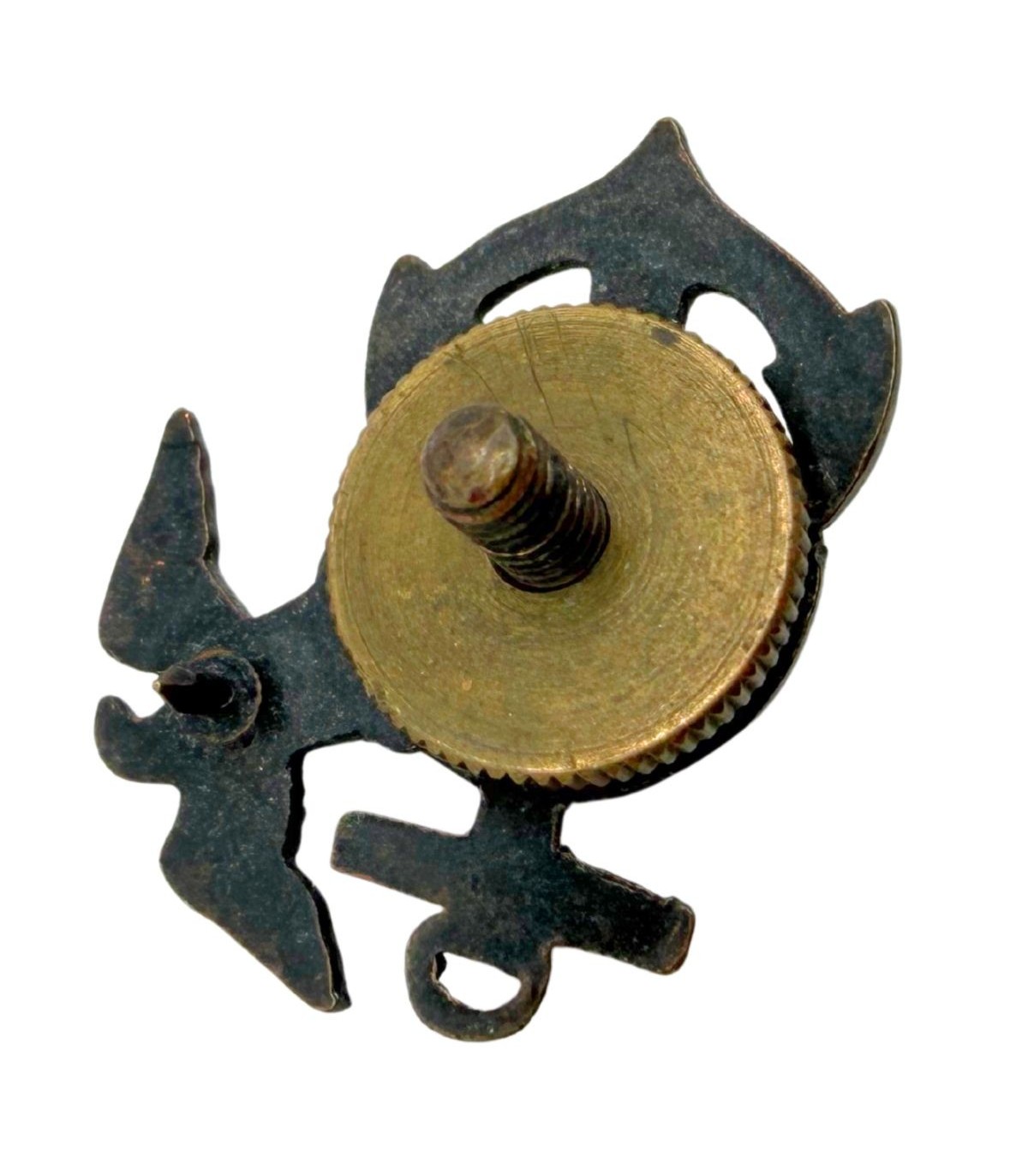 Modèle à visser (screw back), fixation robuste typique des fabrications WWII. Métal (laiton/bronze) avec superbe patine d’origine, détails nets du globe et des plumes. Écrou présent, filetage fonctionnel.