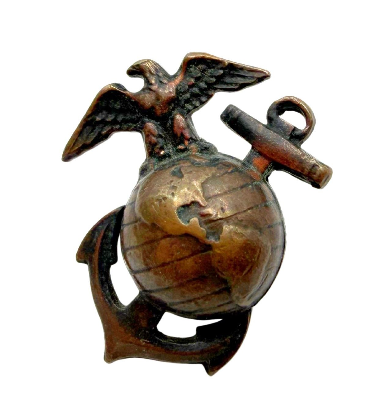 Durant la Seconde Guerre mondiale, cet insigne était porté fièrement par les Marines sur la vareuse de service (Service Alpha) ou sur le calot. Ce modèle spécifique, reconnaissable à son aigle aux ailes déployées sur le globe terrestre et l'ancre de marine, est le témoin des combats acharnés menés dans les îles du Pacifique, de Guadalcanal à Iwo Jima.