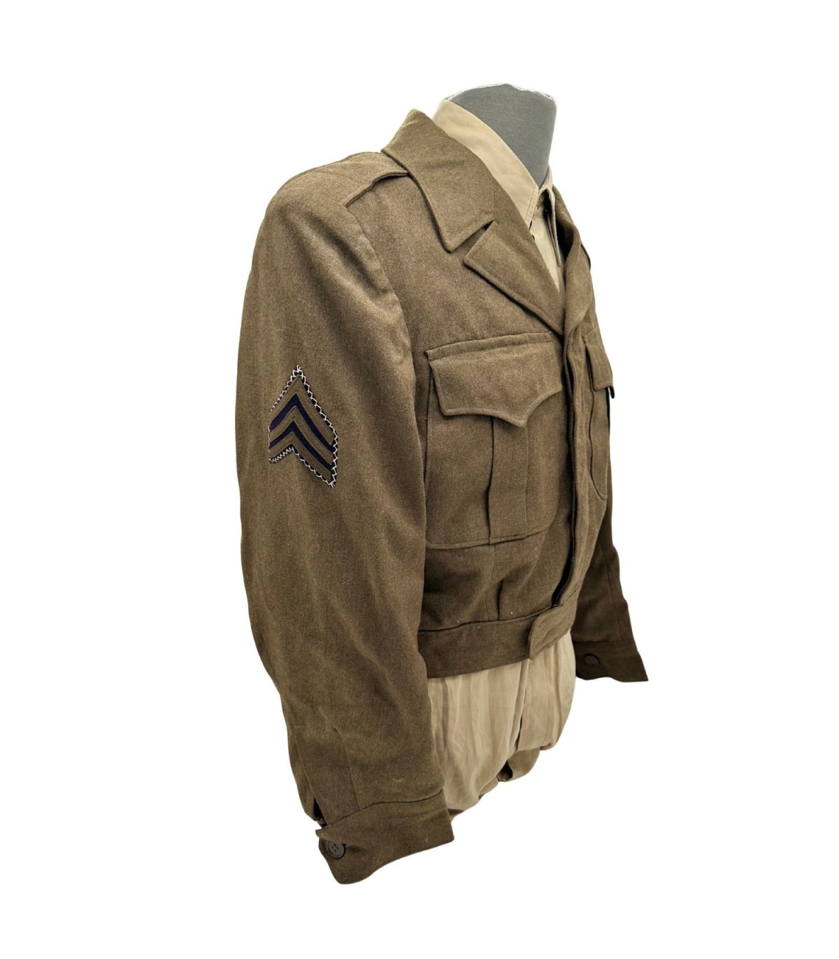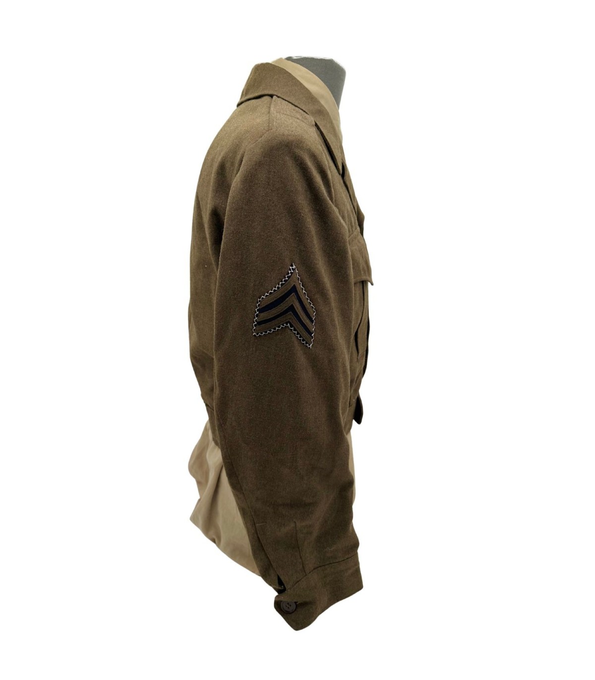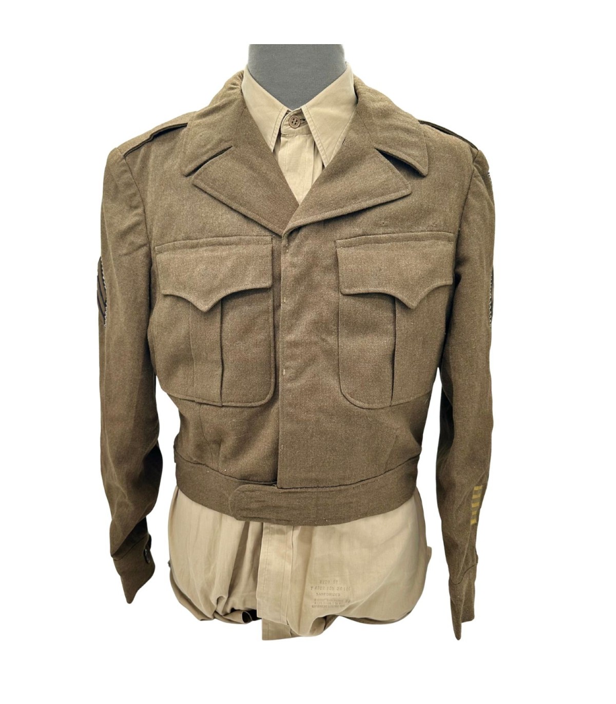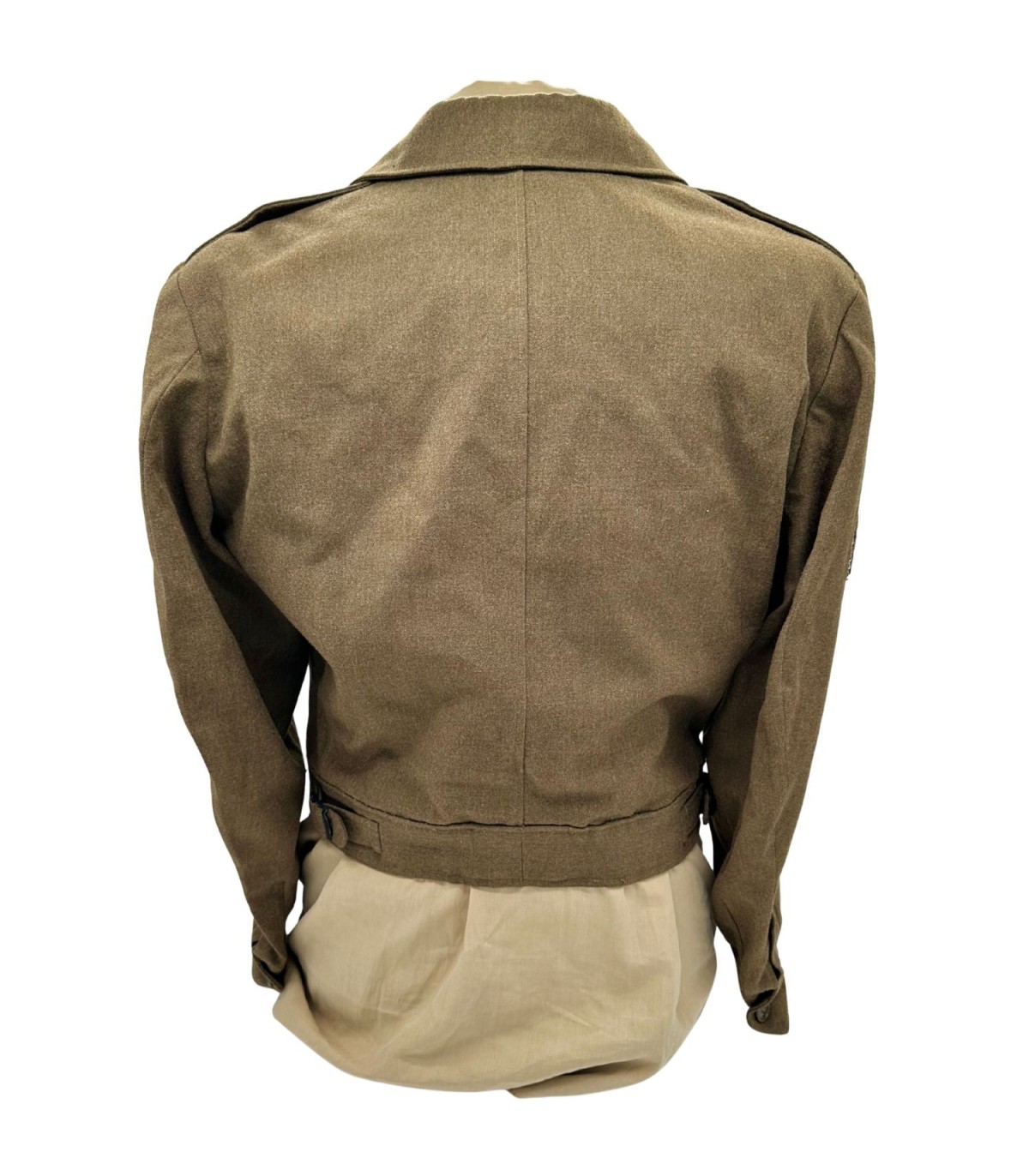 La veste “Ike” tire son nom du général Dwight D. Eisenhower, qui était souvent vu portant ce type de veste. Elle était populaire parmi les officiers et les sous-officiers de l’US Army pendant la Seconde Guerre mondiale. Le modèle a été conçu pour être plus pratique et confortable que les uniformes précédents. Cette veste en particulier a été portée par un membre de l’USAAF, probablement lors d’opérations de transport de troupes en Europe.