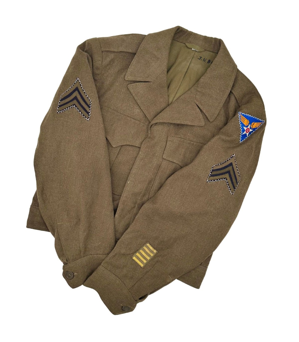Cette veste de sortie authentique de l’US AAF, également connue sous le nom de “Ike Jacket”, a été adoptée en avril 1944. Elle appartenait à un caporal des USAAF.