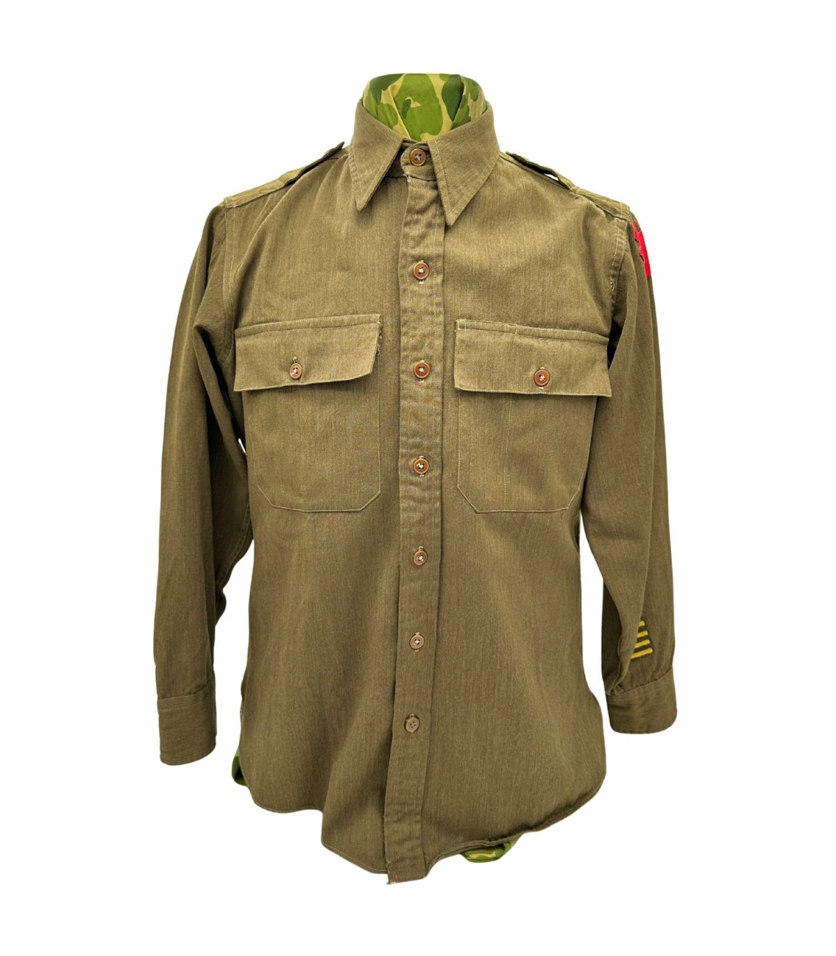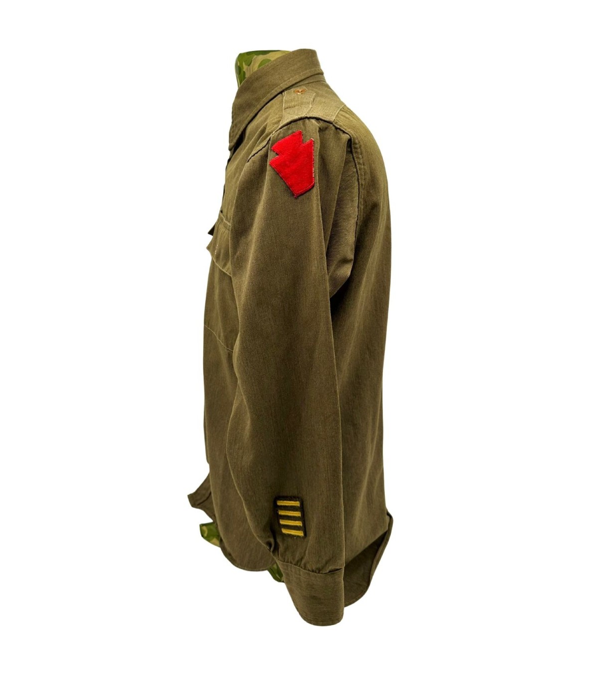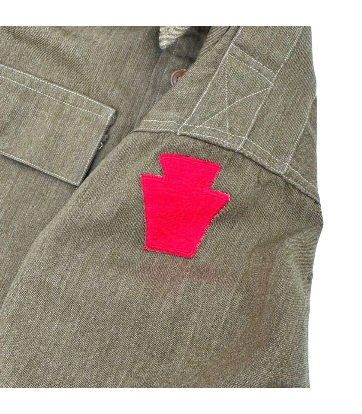Cette chemise pourrait avoir appartenu à un Staff Sergeant engagé dans ces opérations, portant fièrement l’insigne rouge en forme de clé de voûte (Keystone) – symbole de la Pennsylvanie.